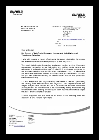 I  write  with  regards  to  reports  of anti-social behaviour,  intimidation,  harassment