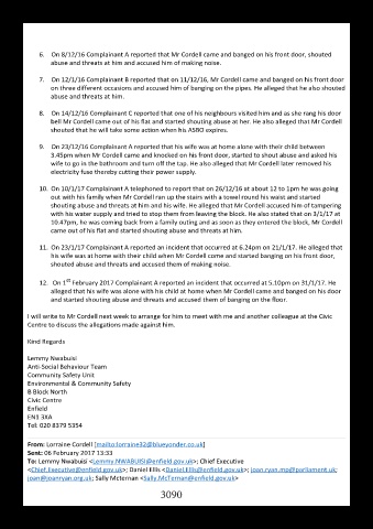 6. On 8/12/16 Complainant A reported that Mr Cordell came and banged on his front door, shouted