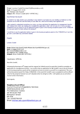 Following the hearing on 9 August and the request for Enfield council to assist Mrs Cordell to complete an