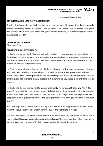 had had admissions to mental hospital. Mr Cordell's father worked as a union representative and his